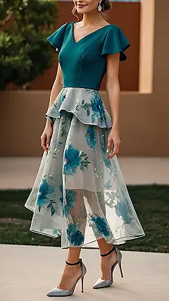 This dress is seriously giving off “I’m classy, I know it, and I’m here to party” vibes. It’s like the fashion version of a secret agent, but instead of saving the world, it’s saving the party from being boring. The teal top is super stylish, and the floral skirt is so pretty and floaty that you could probably convince everyone you’re a garden fairy in disguise.