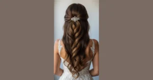 Think of this hairstyle as the ultimate “glow up” before all the wedding cake pics start snapping. The hair clip is like a tiny disco ball for your head, catching all the light and making you look like you’re starring in your own rom-com. Plus, waves are way easier to manage than trying to do some complicated braid that ends up looking like a bird’s nest. Score!