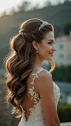 Let’s be real, wedding hairstyles can be tricky. You want something that screams “I’m getting married!” but also whispers “I still know how to braid my own hair!” This hairstyle is like the perfect mix of both – it’s got that fancy braided crown thing going on, but the rest is flowing curls that look like you just woke up looking fabulous (even if you didn’t, and spent two hours getting those curls!)