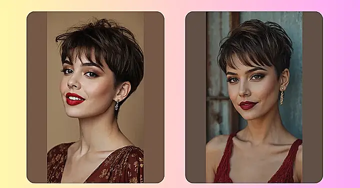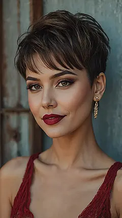 This bixie cut isn’t just about saving time; it’s also a total confidence booster! Just look at how it frames her face in the picture, really making her eyes pop and showing off her awesome features. It’s short enough to feel super fresh and daring, but long enough that you can still play around with it – maybe tuck it behind an ear for a different vibe, or mess it up a bit for that “just rolled out of bed but still fabulous” look. So if you’re thinking about shaking things up and want a haircut that screams “I’m cool without even trying,” the bixie might just be your next favorite thing!
