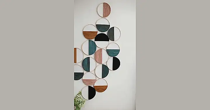 Look at this awesome collection of circular wall decor! It’s like a bunch of art-school cookies decided to hang out on your wall, each showing off just half of its personality. Some are wood-textured, others are smooth and black, or a cool teal – it’s basically a party where everyone’s only showing their good side. Forget boring, plain walls; these circles are here to make your room look like it’s ready for its close-up, and they definitely beat staring at a blank space while you’re trying to figure out your homework.