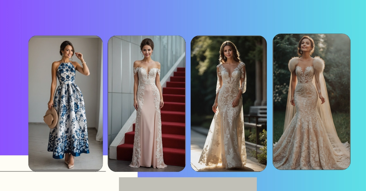 You know that awkward feeling when you’re invited to a wedding and realize your wardrobe mostly consists of hoodies and sweatpants? Well, stress no more about finding the perfect ‘latest wedding guest outfit’ because this look is an absolute winner! Our model here is rocking a gorgeous blue-grey mermaid-style dress, complete with delicate lace flowers that totally say, “I’m here for the love, the celebration, AND definitely the free cake!” It’s stylish enough to get compliments but subtle enough not to accidentally steal the spotlight from the happy couple, which, let’s be honest, is a major wedding guest goal.