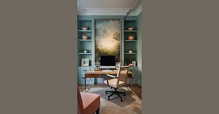 This home office design looks super comfy, right? Like you could totally ace that history essay or finally finish building that awesome Minecraft world. It’s got that “adulting” vibe with the fancy pictures on the wall, but also a chill plant buddy to keep you company when your brain feels like it’s gonna explode.