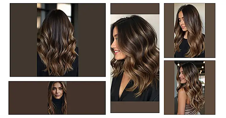 This hairstyle is like a delicious dark chocolate bar with caramel swirls! Imagine the richest, darkest brown as the base, and then picture lighter brown highlights painted in – kind of like someone went wild with a caramel drizzle. It’s totally gorgeous and gives off major “I woke up like this” vibes, even though we all know it probably took a pro and a whole lot of patience to achieve.