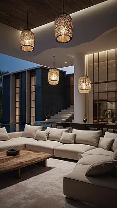 This villa looks like the perfect place to chill out after a long day. The comfy couch is begging you to sink into it, and those cool lights hanging from the ceiling create a super relaxing vibe. Imagine lounging on those fluffy pillows and reading a good book while enjoying the soft glow of the lamps. It’s like a cozy living room, but with a super stylish touch!
