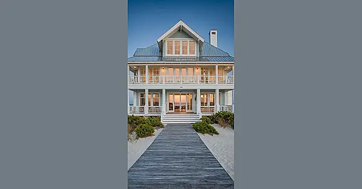 Pulling up to a beach house designed like this feels less like arriving at a vacation spot and more like arriving at the headquarters of Chill Incorporated. Seriously, look at those stairs! Getting your luggage up there after a day of battling seagulls for your snacks is basically an Olympic sport. But hey, at least you can tell everyone you climbed a mountain just to get to the front door. It’s got that classic beachy vibe with the cool grey siding and crisp white trim, looking all fancy but still screaming, “Come on in, just try not to track *too* much sand everywhere.”