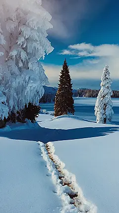 This picture is like something out of a fairytale! Imagine walking through this snowy landscape, the trees are so fluffy, they look like giant marshmallows. You can practically hear the crunch of the snow under your feet and smell the fresh, crisp air. It’s like the whole world is holding its breath, waiting for something magical to happen. You feel like you’re in a movie, about to bump into a talking snowman or a friendly ice dragon. It’s the kind of place where dreams come true, or at least where you could definitely use that cool new sled you got for Christmas!