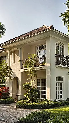 Check out this pad! It looks like it was plucked straight out of a vacation brochure, complete with those awesome palm trees and fancy balconies. This isn’t just a house; it’s a giant “no homework zone” disguised as a luxurious tropical hideout. Forget studying, I’d be practicing my royal wave from one of those elegant iron balconies, pretending I’m the benevolent ruler of my own green paradise, occasionally demanding snacks be brought to me. It’s the kind of place where even the bushes look like they’re having a better time than you are in math class.