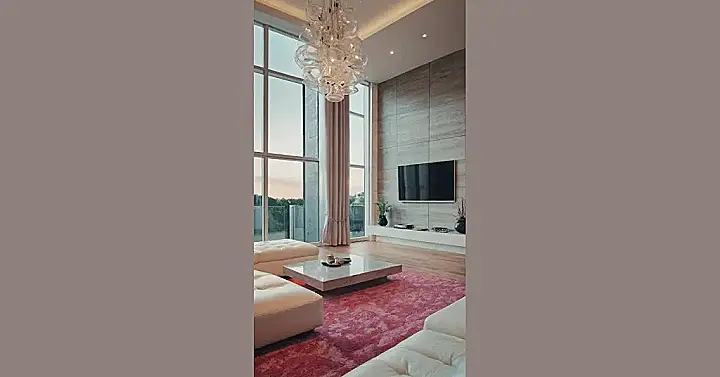 This room is so fancy, it’s like stepping into a cloud! Imagine sinking your toes into that fluffy pink rug, feeling like you’re walking on a marshmallow. The giant windows show off a beautiful sunset, making you feel like you’re in a magazine. Those big, round light fixtures look like they’re about to float away, and the whole place has a chill vibe that makes you want to relax and enjoy the view.