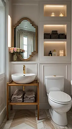 This bathroom proves that small doesn’t mean cramped! Look at how clever the built-in shelving is – it’s like having a secret storage room for all your bath goodies, without taking up any extra floor space. That fancy mirror also helps make the room feel bigger, and who doesn’t love a golden touch? It’s proof that even a tiny bathroom can have tons of personality. Imagine all the fun you could have decorating your own small space with cute accessories and clever storage.