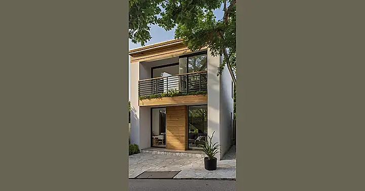 This house is a masterclass in using simple shapes to create something amazing. Instead of looking like a boring box, it’s got a cool balcony, some sneaky greenery, and a fancy door. It’s like someone took a French beret, tilted it just right, and said, “Voilà! A house!” You could totally chill in here after a long day of learning the French Revolution. Plus, it seems to be an ideal location for a game of hide-and-seek!