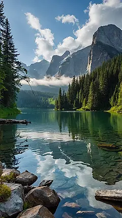 This picture is like nature’s way of saying, “Look at me, I’m awesome!” The mountains are showing off their snowy tops, the trees are doing their best to stand super straight, and the clouds are putting on a light show. But the lake? It’s the real MVP, perfectly reflecting everything like a giant, watery selfie mirror. Bet even the mountains are checking themselves out!