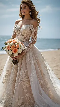 Stepping out in a dress like this peach-toned dream is basically a superpower, making you look effortlessly chic and totally unforgettable. Why stick to boring traditions when you can strut down the aisle looking like a walking, talking sunset? You won’t just be saying ‘I do’; you’ll be saying ‘I do, and I look amazing doing it, in a color that actually suits me!’ It’s all about making your special day truly yours, even if it means gently shocking a few relatives who were expecting pure white. Spoiler alert: theyโll still cry, but probably happier tears because you look so good!