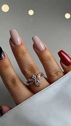 But wait, what’s going on with that ring? It looks like a delicate gold chain with a fancy black ring. Maybe it’s part of a cool, trendy set! Or maybe it’s just a really awesome ring that someone picked out to show off their unique style. Either way, it’s a nice touch that adds a little extra pizzazz to this whole nail game!