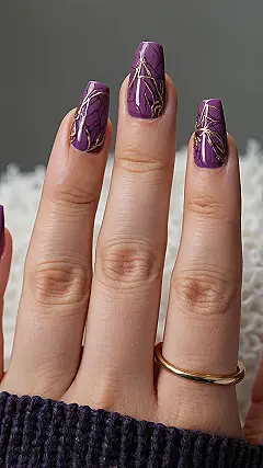 And can we talk about those gold designs? They’re not just lines; they’re like tiny, shimmering works of art, twirling and sparkling over the rich purple base. It almost looks like a secret map to buried treasure, or maybe just the perfect accessory for when you want to feel extra fancy while still rocking your favorite comfy sweater. These nails are basically telling everyone, “Yes, I’m stylish, and no, I did not wake up like this… unless I did, then wow!”
