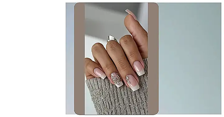 Check out these nails that clearly got the memo about summer fun: “Go big or go home!” They’ve taken the classic French tip and added a full-on sparkle party with those amazing silver leafy designs. You can almost hear them whispering, “I’m ready for that fancy backyard BBQ, or maybe just a casual stroll where I accidentally catch the sun just right and dazzle everyone.” They’re perfect for holding your favorite slushy or showing off your latest friendship bracelet, making sure your hands are just as ready for summer adventures as you are.