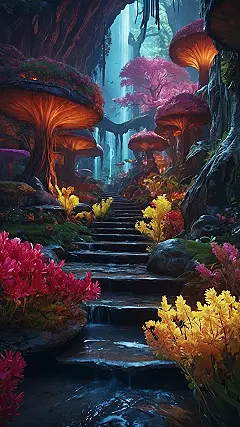 This wallpaper is like stepping into a video game! Imagine walking up these glowing stairs, surrounded by giant, friendly mushrooms that look like they’re lit from within. The vibrant flowers and waterfall add a magical touch, making it the perfect background for someone who dreams of exploring fantastical lands filled with talking trees and maybe even a friendly dragon or two. It’s the kind of place where you’d expect to find a hidden portal to another world – maybe even a world made entirely of candy!
