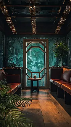 This image is like stepping into a secret, super-swanky jungle hideout! Imagine having this lush, tropical scene as your iPhone wallpaper. It’s got those seriously cool lamps hanging from the ceiling, comfy leather couches perfect for lounging, and a view through a fancy window that makes you feel like you’re on a secret island adventure. Forget boring backgrounds – this is epic wallpaper that’ll make your phone the envy of everyone!