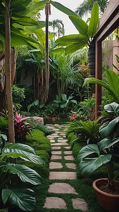 This picture shows a small, but perfectly formed tropical garden. It’s like a little slice of paradise tucked away in someone’s backyard! The lush green plants create a sense of privacy and seclusion, while the winding pebble path invites you to explore. You can practically hear the gentle rustling of leaves and the sound of birds singing in the distance!