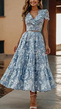 This outfit is like a breath of fresh air – it’s totally floral, totally blue, and totally rocking that springtime vibe. You can just picture yourself walking through a field of flowers, sunshine warming your face, and the scent of blooming blossoms filling the air, all while looking absolutely fabulous in this frock. The dress has these cute little flowers all over it, like a garden party just exploded all over the fabric! And that smile? It’s almost as bright as the flowers themselves.