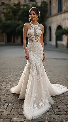 Look at all those intricate lace details – it’s like a garden party decided to have a formal ball and put on a dress! The delicate floral patterns add such a romantic touch, making the whole outfit feel both classic and totally modern. With a stunning dress like this, you’d probably feel like you could float down the street, even if you’re just trying not to trip over the gorgeous, flowing train. It’s definitely a dress designed to make anyone feel like they’re starring in their own fairytale, cobblestone street and all!