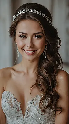 And hold up, let’s not zoom past the rest of her vibe! That sparkly headpiece isn’t just sitting there; it’s practically throwing a little glitter rave on her beautiful down-do, and those dangling earrings are ready for their close-up. It’s like her hair is saying, “Yeah, I’m relaxed, but I’m also rocking some serious bling, thank you very much!” She’s definitely proving you can be super classy, look like a million bucks, and still have your hair ready for wind machine moments or just looking effortlessly gorgeous for all those wedding selfies.