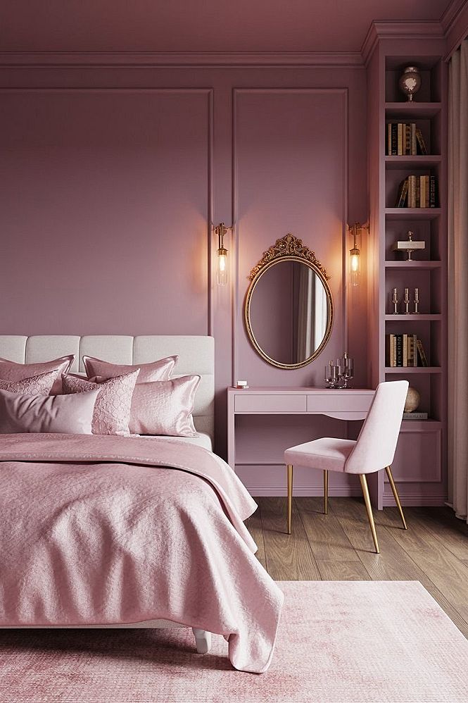 Experience a truly glam room aesthetic with this pink and mauve bedroom. The plush living room vibe is perfectly encapsulated, showcasing how to bring sophisticated design interior living room concepts into your personal space.