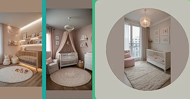 Getting a newborn room ready feels like setting up a tiny, fluffy palace, and this picture shows off the royal suite! Everything is soft and calming, like that giant cozy rug just begging for bare feet (or maybe tiny hands). Notice the pink pouf chair and the little furry stool? They look like clouds you could just sink into while holding a sleepy baby. Creating a perfect newborn room is a serious business of picking out cute teddy bears for the shelves and making sure the crib is just right for the most important little person in the house.