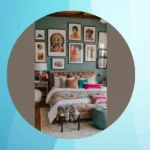 Step into this bedroom, and you might think a rainbow exploded, then an art gallery decided to crash the party, and honestly, we’re here for it! This isn’t just a room; it’s a full-blown visual feast where ‘less is more’ clearly got lost on the way. Check out that epic gallery wall, packed with so many framed treasures it’s practically a museum exhibit dedicated to coolness. Every single picture tells a story, and together they create a vibe that screams ‘I’m fabulous, and I know it’ – which is totally the energy we all need for our morning routine!