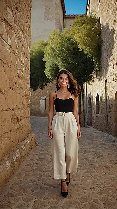 Wearing an outfit like this just gives you a little extra strut in your step. You feel put-together and ready for anything, whether it’s dodging rogue pigeons or deciding which ancient archway makes the best photo spot. Plus, the wide-leg style is basically the ultimate disguise for when you’ve eaten one too many pastries. Nobody needs to know; you’re just owning the comfy-chic vibe! It’s the perfect blend of looking effortlessly cool and secretly being ready for a nap.
