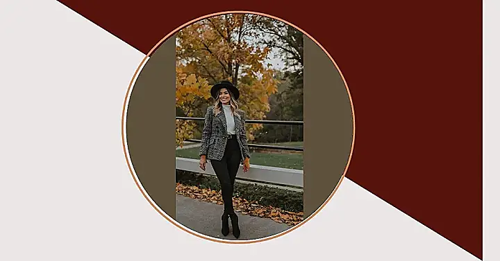 This picture shows a woman rocking a seriously classy Thanksgiving outfit! Imagine strolling through a park, all the leaves are crunchy underfoot, and you’re looking totally stylish in your amazing blazer. It’s like a fall fashion fairytale, only instead of a prince, you’ve got a killer outfit and maybe a pumpkin spice latte waiting for you at home. You could totally pull this look off at your family’s Thanksgiving dinner, and then later, while helping your aunt with the dishes, you’d still look fabulous.