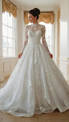 Look at this showstopper! From the dreamy lace cascading down to that magnificent train, this gown is basically begging for a dramatic entrance. And can we talk about how those long sleeves perfectly complete the whole vibe? They add a touch of sophisticated charm without making it look stuffy – perfect for twirling on the dance floor without worrying about any fashion mishaps. You could totally conquer the world (or at least your wedding day) in something this fabulous, proving that wedding dresses with sleeves are not only gorgeous but also super practical for all your celebratory moves.