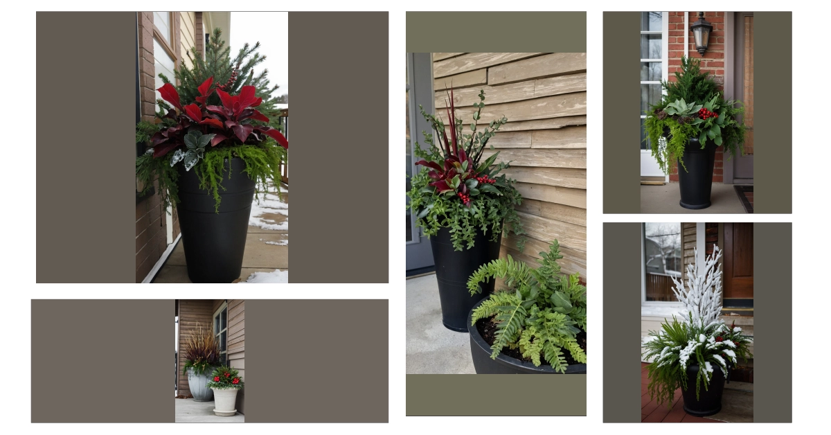 The image shows a beautiful winter planter on a front porch. It’s filled with lush green plants, maybe even some red berries, and has a super cool, rustic-looking pot that’s a mix of gray and brown. It’s like the planter is saying, “Even though it’s cold outside, I’m still bringing some life and color to this place!” Imagine walking up to this porch, especially on a snowy day. It’s the perfect way to say, “Welcome home!” without even saying a word.