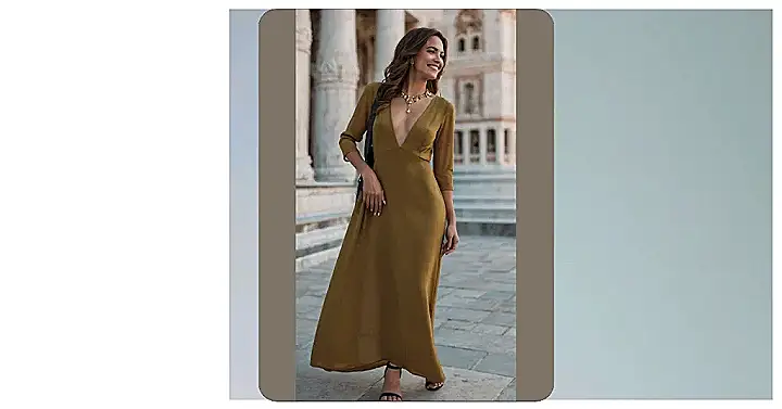 The picture shows a woman looking like a total queen in a gorgeous fall maxi dress. It’s the kind of outfit you wear when you want to feel like you’re walking on sunshine. The mustard yellow color is perfect for fall, and the dress flows like a waterfall, making it look super comfy and stylish.