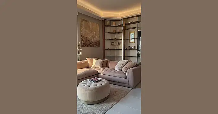 This living room is like a cozy cloud, but way more stylish! The big, comfy sectional couch looks like it’s begging you to curl up with a good book or maybe a giant bowl of popcorn. It’s the kind of couch you could spend a whole weekend on, without even getting up for a snack (but let’s be real, who actually does that?). The fluffy rug and plush pillows make the whole space feel like a giant, comfy hug, and the little ottoman is just asking to be used as a footrest.
