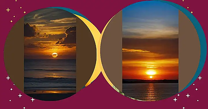The sky is on fire! It’s like someone spilled a giant bucket of orange juice all over the clouds, and the sun is the biggest, juiciest orange you’ve ever seen. It’s a perfect sunset, except for one thing: the sun is doing a double-take. It’s reflected in the water below, making it look like there are two suns hanging out together.