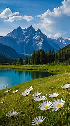 This picture is like stepping into a nature magazine! It’s got all the good stuff: a big ol’ mountain reaching for the sky, a lake so blue it could be a swimming pool for giants, and a whole field of happy daisies smiling up at the sun. You can practically smell the fresh mountain air and feel the breeze blowing through your hair. It’s the kind of view that makes you wanna pack a picnic and spend the whole day soaking it all in!