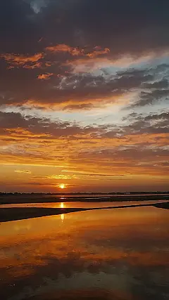 The sky is on fire! It’s like someone spilled a giant bucket of orange juice all over the clouds, and the sun is the biggest, juiciest orange you’ve ever seen. It’s a perfect sunset, except for one thing: the sun is doing a double-take. It’s reflected in the water below, making it look like there are two suns hanging out together.