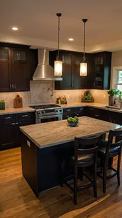 This kitchen is giving us major “I wish I lived here” vibes! Imagine whipping up a feast on that sleek stovetop, while the delicious smells waft through the room. It’s like stepping into a magazine, with the dark cabinets and shiny countertops. And that island? Talk about the perfect spot to gather with your friends or just relax with a good book and a glass of lemonade.