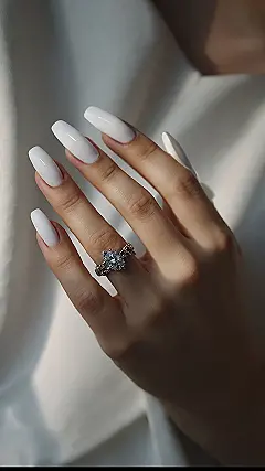 These nails are so white, they’re practically glowing! Imagine trying to write with these bad boys – you’d probably end up with a whole lot of white smudges and a very confused teacher. Seriously though, those nails are like little beacons of light, especially when they’re paired with that sparkly ring! It’s like the nails are saying “hey, look at me!” and the ring is whispering “but don’t forget about my bling!”