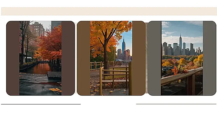 This picture shows New York City looking like it’s wearing its best autumn outfit! The trees are decked out in fiery reds, oranges, and yellows, like nature’s own fashion show. The skyscrapers in the background act like a giant backdrop, making the whole scene feel like a beautiful painting.