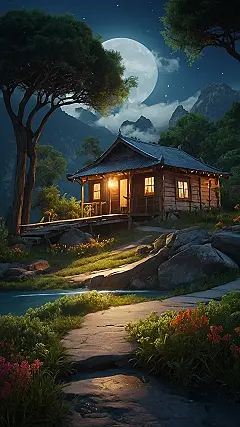 Imagine this: you’re chilling in a cozy cabin, the moon is shining bright, and all you hear are the sounds of nature. No wifi, no phone calls, just pure relaxation. That’s exactly what this image makes me feel – like I’m on a peaceful retreat in the middle of nowhere. The cabin looks super comfy with its warm lights, and the path leading up to it is like an invitation to escape the hustle and bustle of everyday life. It’s a perfect place to unwind and appreciate the beauty of the world around us.