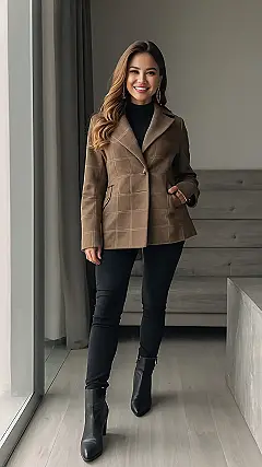 This outfit is giving major boss vibes! The green blazer looks super stylish with the black trim, and those black tights are totally adding to the elegant look. It’s like she’s ready to take on the world, one important meeting at a time. You can totally picture her walking into a big office building, giving everyone a confident smile, and making everyone else wish they had her fashion sense!
