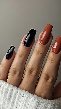 These nails are totally rocking the fall vibes! Black and orange? It’s like a spooky pumpkin pie on your fingertips. Who knew such a classic combo could be so chic? You can totally rock these nails for a casual hang with friends or even a fancy party!
