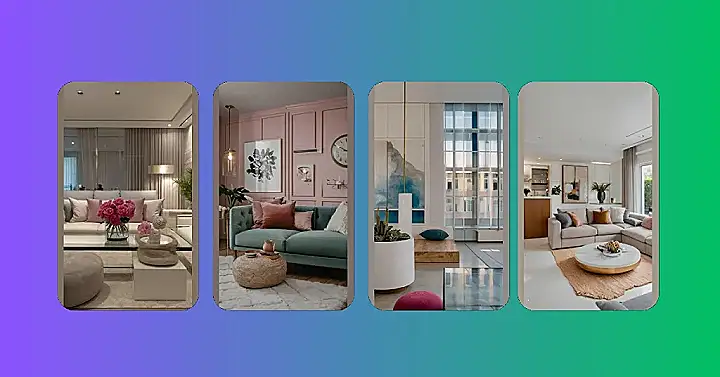 This living room is definitely comfy, with a plush armchair perfect for sinking into with a good book. It’s got all the cozy vibes – a fluffy rug, a warm candle, and a cool, modern ottoman. But, what’s with that giant mirror on the floor? It’s like they’re trying to make you feel like you’re floating in the middle of a giant, colorful puddle! I wouldn’t be surprised if the next thing you see is a fish swimming by.