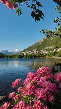 This picture shows a beautiful lake surrounded by lush green mountains. It looks like the perfect place to relax and enjoy the fresh air! Imagine taking a boat ride on the clear blue water, or maybe going for a swim on a hot day. The snow-capped peaks in the background make the scene even more majestic, and the bright pink flowers add a touch of color and beauty to the whole scene. It’s like a real-life postcard!