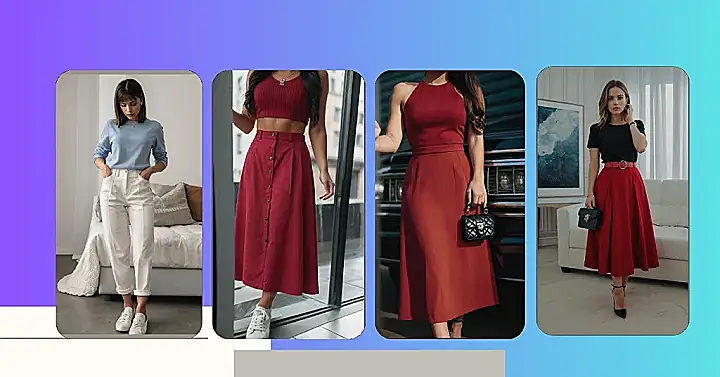 This outfit is like the perfect blend of comfy and cool! You can totally see yourself rocking this look for a casual day out with friends or even a fancy dinner. The red crop top is super cute and it looks amazing with the flowy skirt. It’s like a classy princess who decided to ditch the stilettos for some comfy kicks!