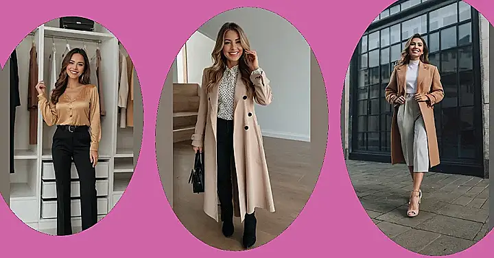 The woman in this picture looks super stylish in her long, flowing beige trench coat. It’s like she’s ready to solve a mystery, but instead of a detective’s hat, she’s rocking a cute polka-dot blouse. The whole outfit is so put-together, she’d probably look great even if she accidentally spilled coffee on herself (don’t worry, we’re not suggesting you try that!). This is the kind of outfit you can wear anywhere, from a casual brunch to a fancy art gallery.