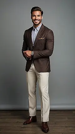 This guy knows how to dress! He looks like he’s about to walk into a fancy dinner party or maybe even a swanky art museum. That brown jacket is super sharp, especially with the little pocket square. He’s rocking those classic white pants too, like they’re made for him. It’s that kind of look that never goes out of style, like a cool vintage record or a good book – always fresh and always in!