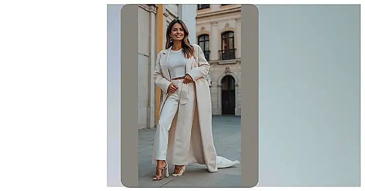 The image shows a woman rocking a super stylish fall outfit! She’s wearing a long, flowing white coat that would keep anyone warm on a chilly autumn day. It’s like she’s ready for a stroll through a pumpkin patch or a visit to a cozy coffee shop, but instead of wearing jeans and a sweater, she’s got her own unique, chic style going on. With those white pants and the matching coat, she looks like a total fashionista! And those shoes? They’re definitely adding some extra flair to her look!